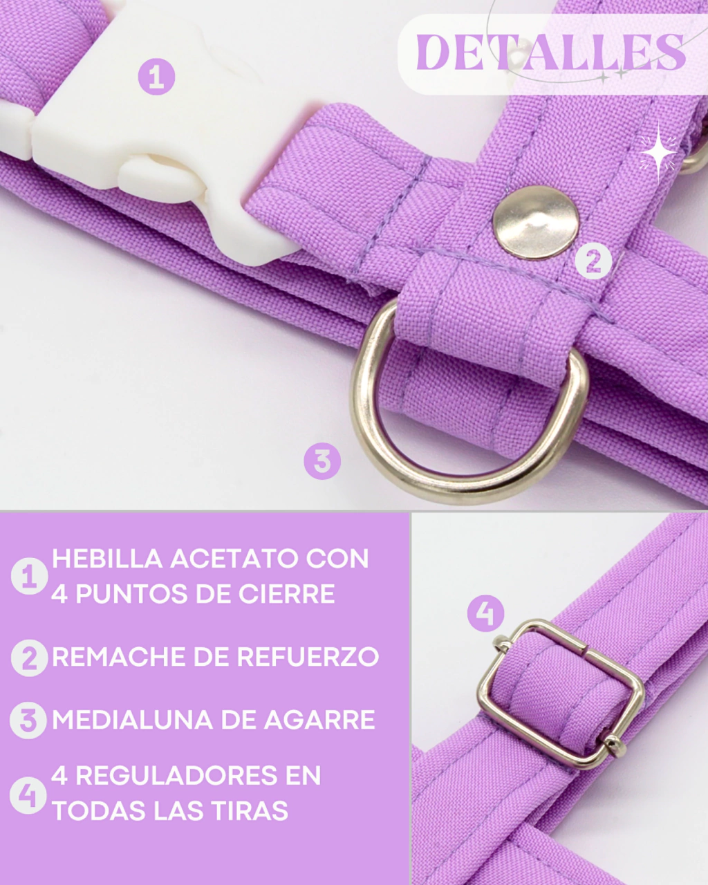 El diseño en forma de H evita que tu perro se lo pueda quitar solo, permitiendo que se mueva libremente. Están confeccionados con cinta de poliéster de alta resistencia, forrada con telas suaves al tacto. La hebilla de acetato cuenta con 4 puntos de cierre para mayor seguridad. Además, incluye reguladores en todas sus tiras para un ajuste perfecto, costuras reforzadas y remaches para una durabilidad excepcional.
