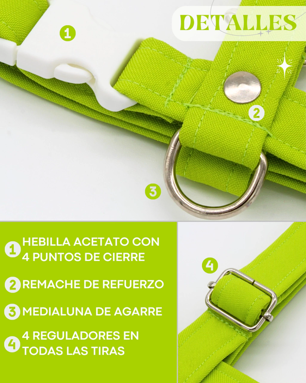 El diseño en forma de H evita que tu perro se lo pueda quitar solo, permitiendo que se mueva libremente. Están confeccionados con cinta de poliéster de alta resistencia, forrada con telas suaves al tacto. La hebilla de acetato cuenta con 4 puntos de cierre para mayor seguridad. Además, incluye reguladores en todas sus tiras para un ajuste perfecto, costuras reforzadas y remaches para una durabilidad excepcional.